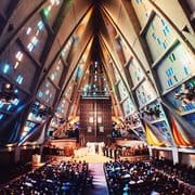 The “bones” of the new sanctuary were 19 massive poured-in-place concrete piers that extend from beneath the basement-level upward to meet 73 feet above the main aisle. Other basic structural elements were poured in place except the roof panels, which were precast, raised by a crane, and tied together at the ridge. 1,500 brilliantly hued small glass inserts were installed from a high interior scaffold. To ensure good acoustics, the face of the balcony was undulated. The unique circular motif lighting fixtures, made of spun steel with a brass finish, weigh 600 ilbs and were bolted to the roof. (As the building neared completion, Mr. Steiner and Dr. Stuart, in a mischievous moment, scaled the scaffold to carve their initials high above the chancel!)