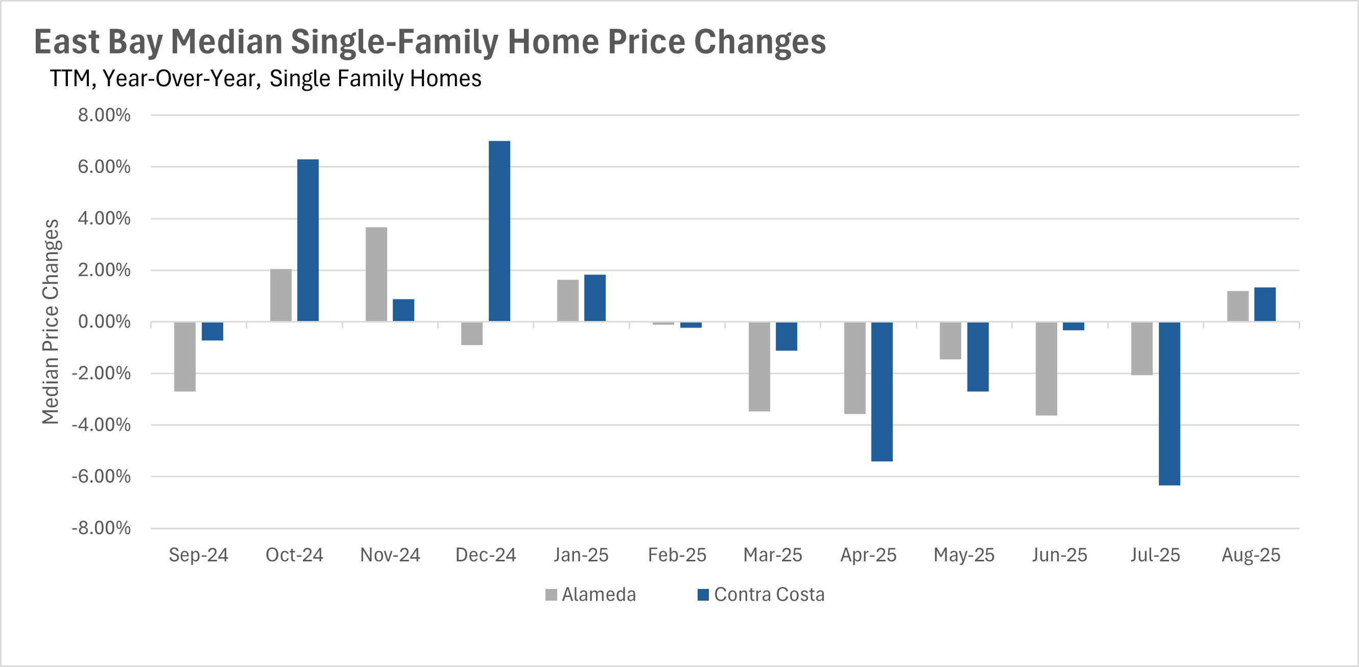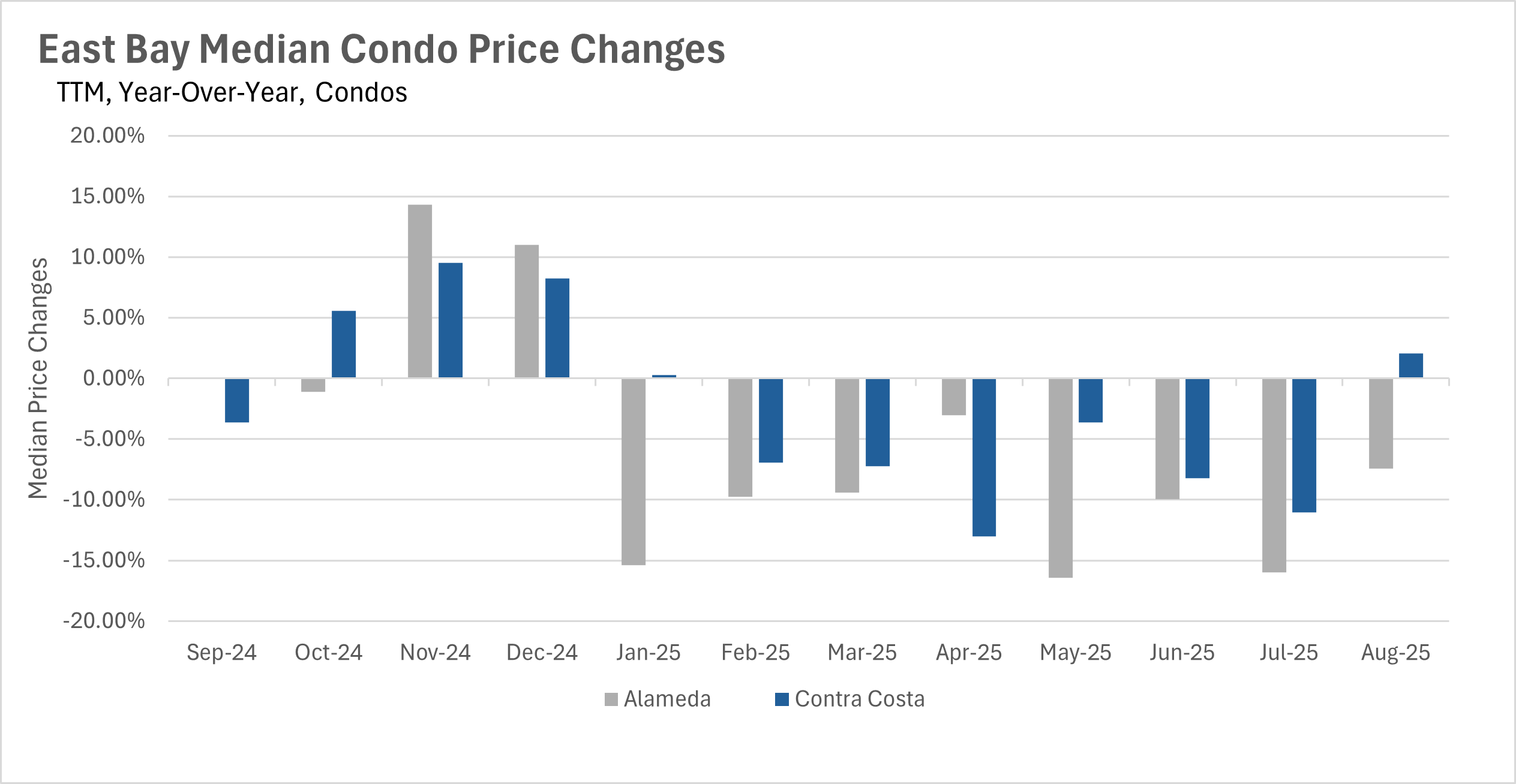 Over the past few months, we have seen nothing but year-over-year declines in median sale price throughout the East Bay. However, for the first time in 6 months, we saw median sale prices increase in August. Median sale prices for single-family homes increased by 1.20% and 1.33% in Alameda and Contra Costa Counties, respectively. Unfortunately, when we turn to the condo market, we did not see the same widespread increase in values, with median sale prices increasing by 2.04% on a year-over-year basis in Contra Costa County, and decreasing by 7.41% in Alameda County.
