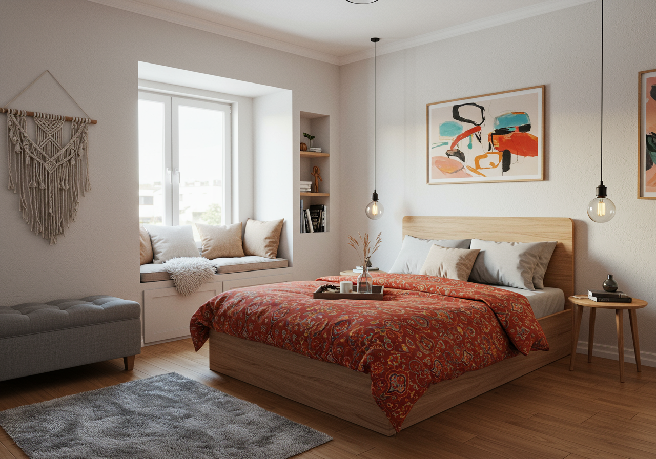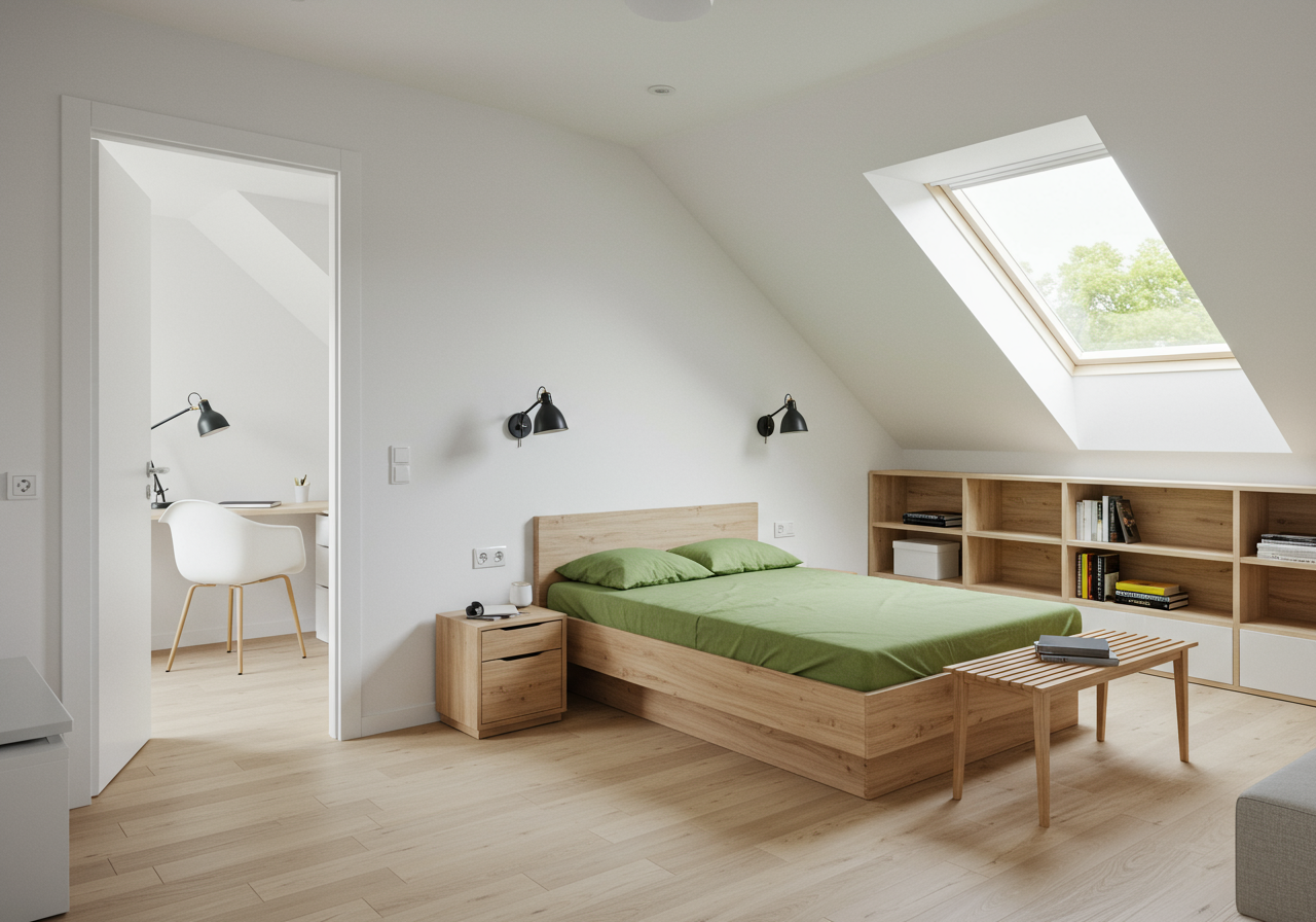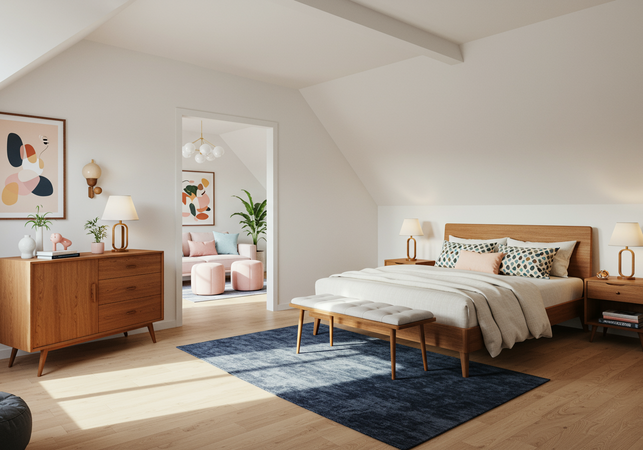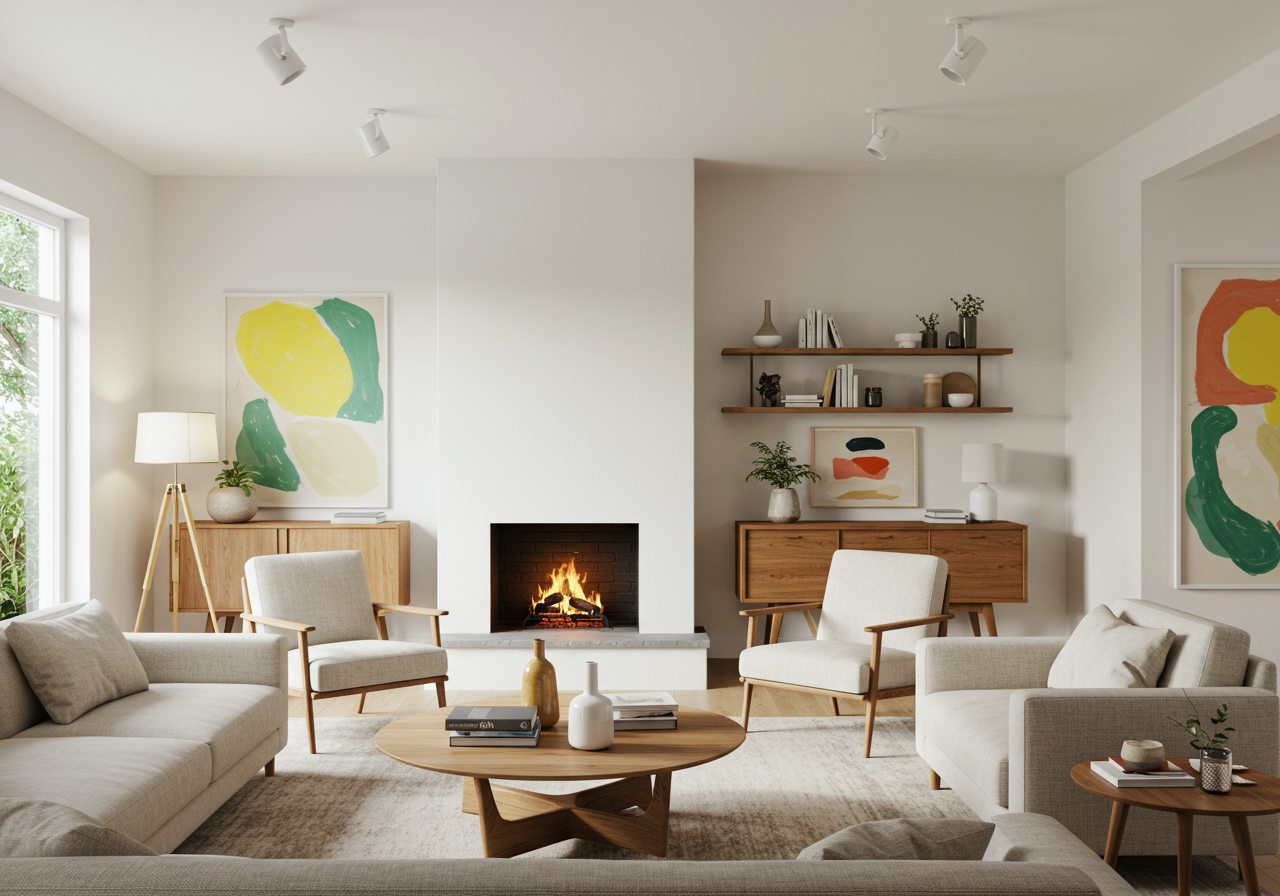 To create a modern feel while staying true to the idiosyncrasies of the house, we chose a neutral color palette (Simply White by Benjamin Moore and School House by Farrow & Ball). We designed the staging with a California Modern style and used some architectural books as a nod to the seller! We also used Caldwell Green from Benjamin Moore on the upstairs bookcases, just to give it a pop.
